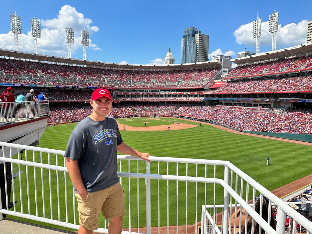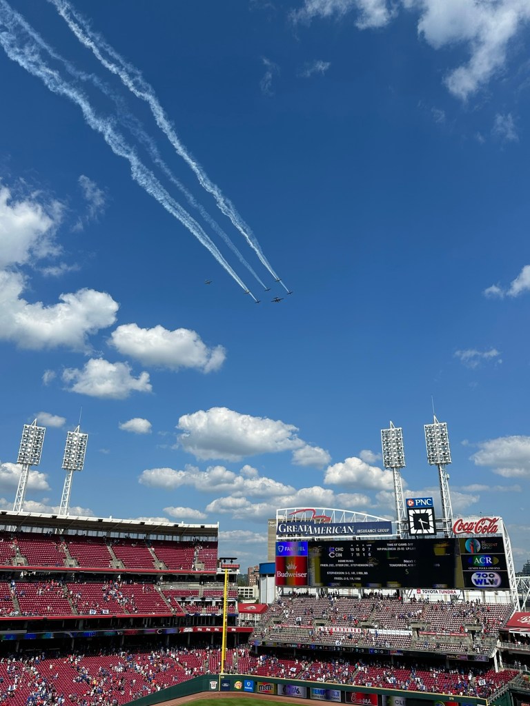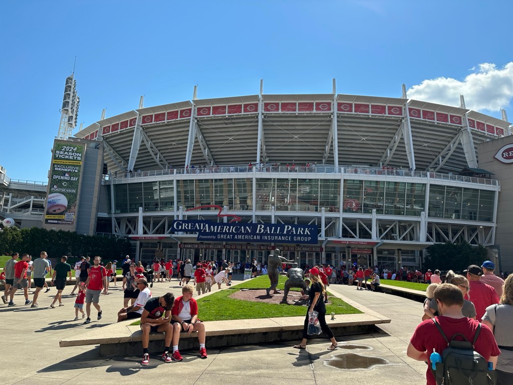 Another thing that (unfairly) worked against Great American Ball Park was the heat. Cincinnati saw a high of 92℉ that day. We did have the benefit of water fountains to refill our bottles, but the uncomfortable weather definitely impacted our moods and therefore our overall experience. The lack of overhang in the upper deck made shade very difficult to come by. The outfield, particularly in right field, did provide some respite from the sun. But our seats in the first couple rows of section 435 along the first base line did not have that same luxury. It also didn’t help that the game, a 15-7 win in favor of the Chicago Cubs, was over three hours and fifteen minutes long. The Cubs scored seven runs in the 8th and three more in the final frame during the hottest part of the day. It truly felt like the game would never end. Watching Elly De La Cruz strike out four times helped to ease the pain.