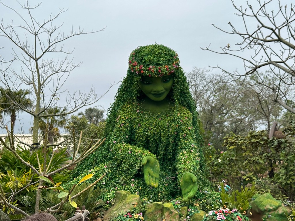 We also got to check out Epcot’s newest attraction, Journey of Water, Inspired by Moana. This is a walk-through, self-guided outdoor trail that uses familiar characters from Moana to educate about water — from the water cycle to water conservation. Honestly, we had low expectations for this, thinking it was just a simple way to disperse crowds, but we were pleasantly surprised! While a bit crowded right at the beginning of the trail, things thinned out, and we had no problem getting to experience the different interactive elements. Overall, we really enjoyed this attraction and think it’s a great addition to Epcot!