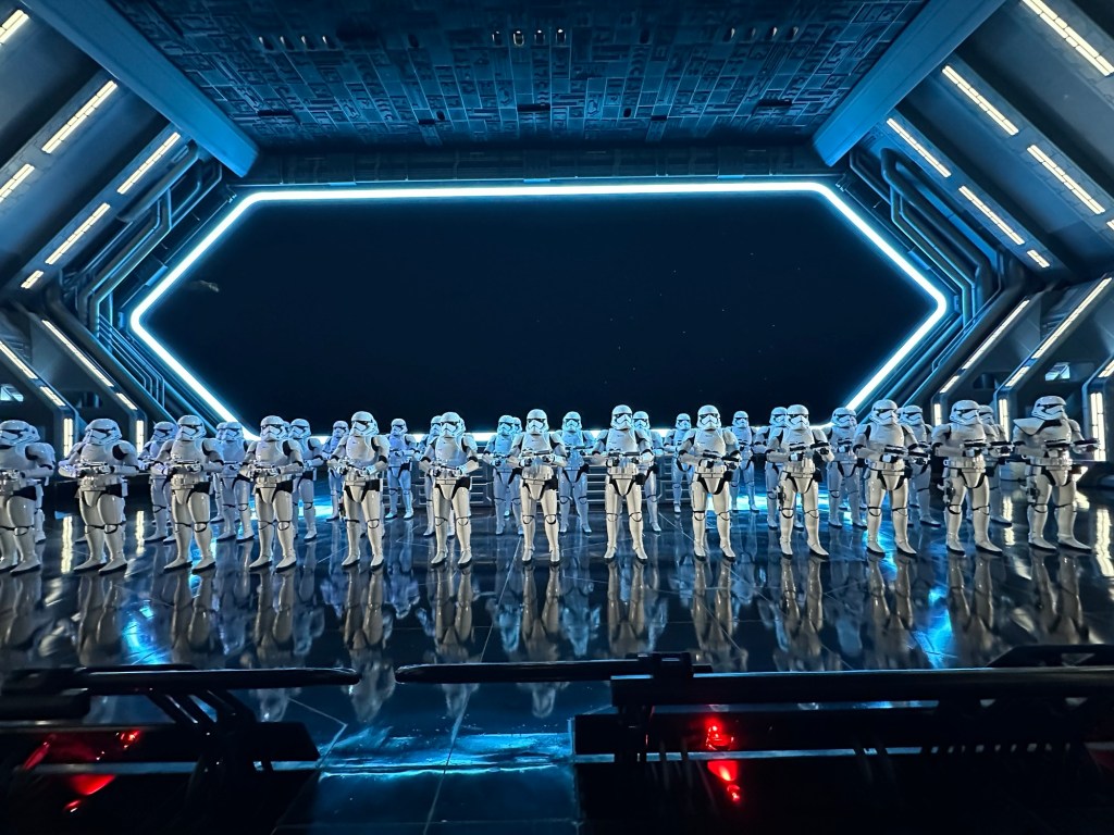 After lunch, we hit Star Tours, which, depending on the video sequence we got, could have proved detrimental to the rest of our day. However, thankfully, we did not receive the floating-in-water experience which always leaves me feeling ill. We were excited that our ride included the newest scenes featuring Darth Vader, the Mandalorian and Grogu, and Ahsoka Tano.