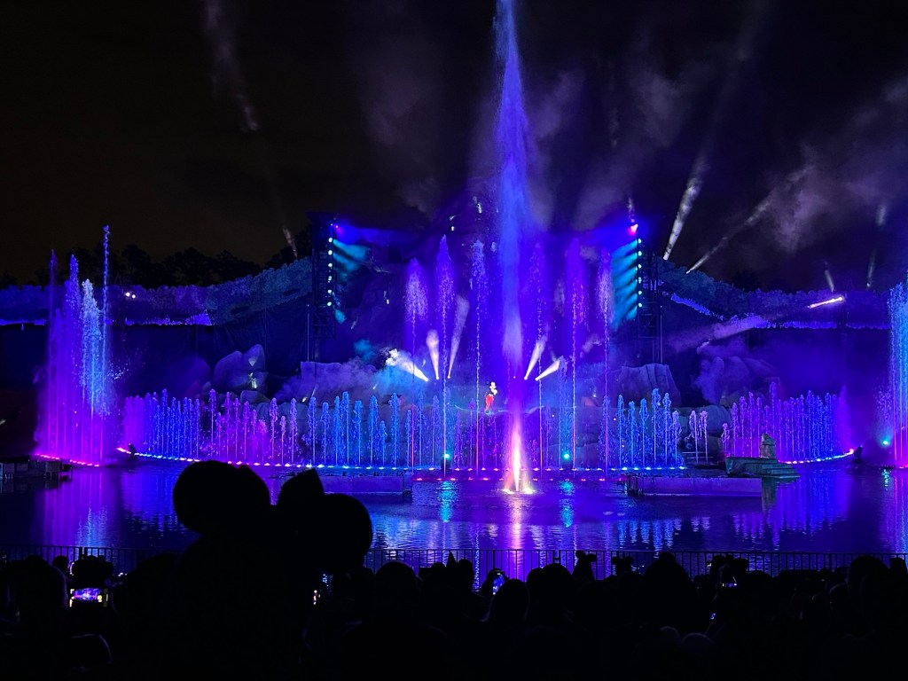 We went into this trip knowing that we wanted to do Fantasmic, even though neither of us are into the nighttime shows since that’s prime riding time, since we didn’t get a chance to go during our honeymoon. While there were two shows listed, one at 8pm and one at 9:30pm, the park closed at 9pm with an after-hours event starting immediately after, so we weren’t sure if we would be able to attend the later show. A quick Google search confirmed that we would be able to attend the 9:30pm show even though the park would be closed. At around 8:50pm, we made our way over to Sunset Boulevard to get lined up for the show. Line is a generous term for what it was — it was more of a blob mob, but there were cast members offering some level of direction. At 9pm, we began the trek to the theater for the show. I do not exaggerate when I say trek; it’s quite a hike to get to the theater, but there are restrooms and concession stands once you get there.