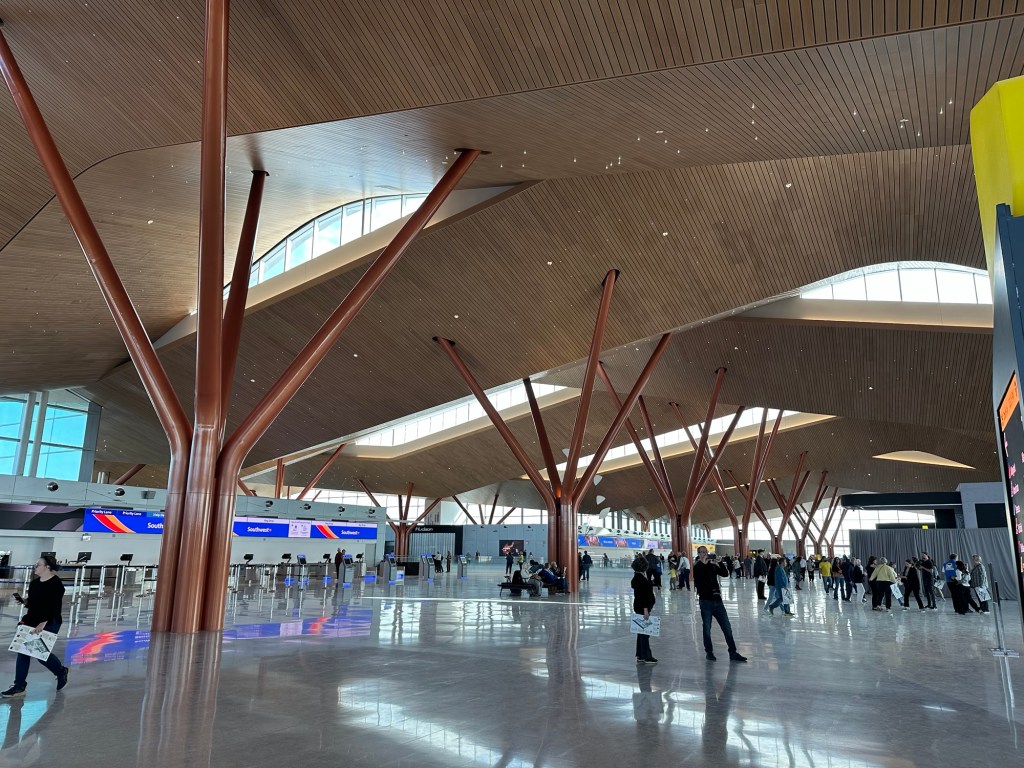 Once you take the elevator up to the top floor, you’ll be hit with the wow-inducing moment of seeing the new vaulted ceilings of the Departures terminal. Letting in an abundance of natural light, the wood planks above you mimic the rolling hillsides of Western Pennsylvania. It truly leaves you in awe when you glimpse it for the first time. One cool feature is the sparkling, star lighting that will really pop for those early mornings or late nights at the airport. Since we were there mid-day, we couldn’t experience the full effect. I’m definitely excited to see what this terminal looks like in the moments where those lights can truly shine (no pun intended). Certainly, though, these ceilings feel incredibly timeless and elegant, far surpassing the dreariness that I felt on the previous ticketing level.