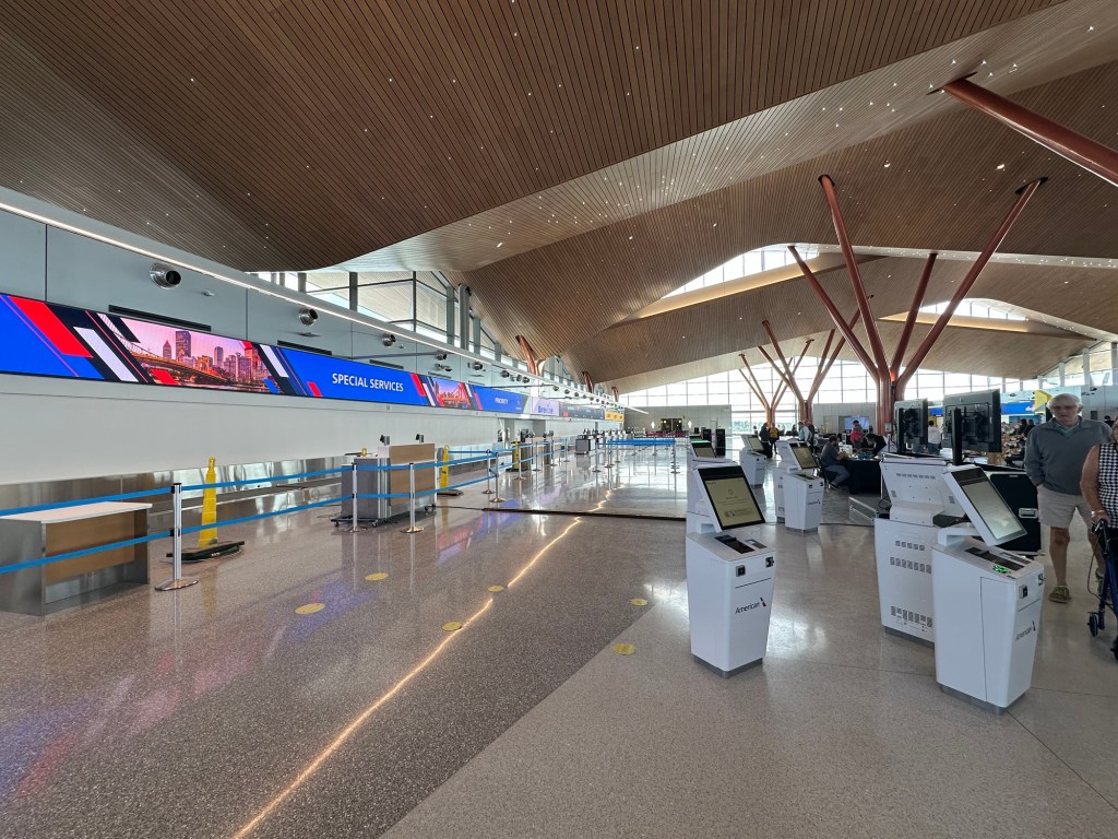 Now that 95% of passengers start or end their trip in Pittsburgh rather than use the airport to connect, the warts of the landside terminal became more apparent. If you entered the building from the parking lots, you would first need to head upstairs to go to bag check. This sprawling space, with its noisy tile floors, burgundy & navy color scheme, and some brutalist concrete architecture to top it off, was trapped in the 90s. Especially for those early morning flights, it felt like a gloomy way to start a trip. After checking in, you’d then have to go back downstairs for security, which significantly lacked capacity since it wasn’t designed with locals in mind. You’d have to cross your fingers that the alternate security checkpoint (if you know, you know) would be open, which usually got you through TSA in less than five minutes.